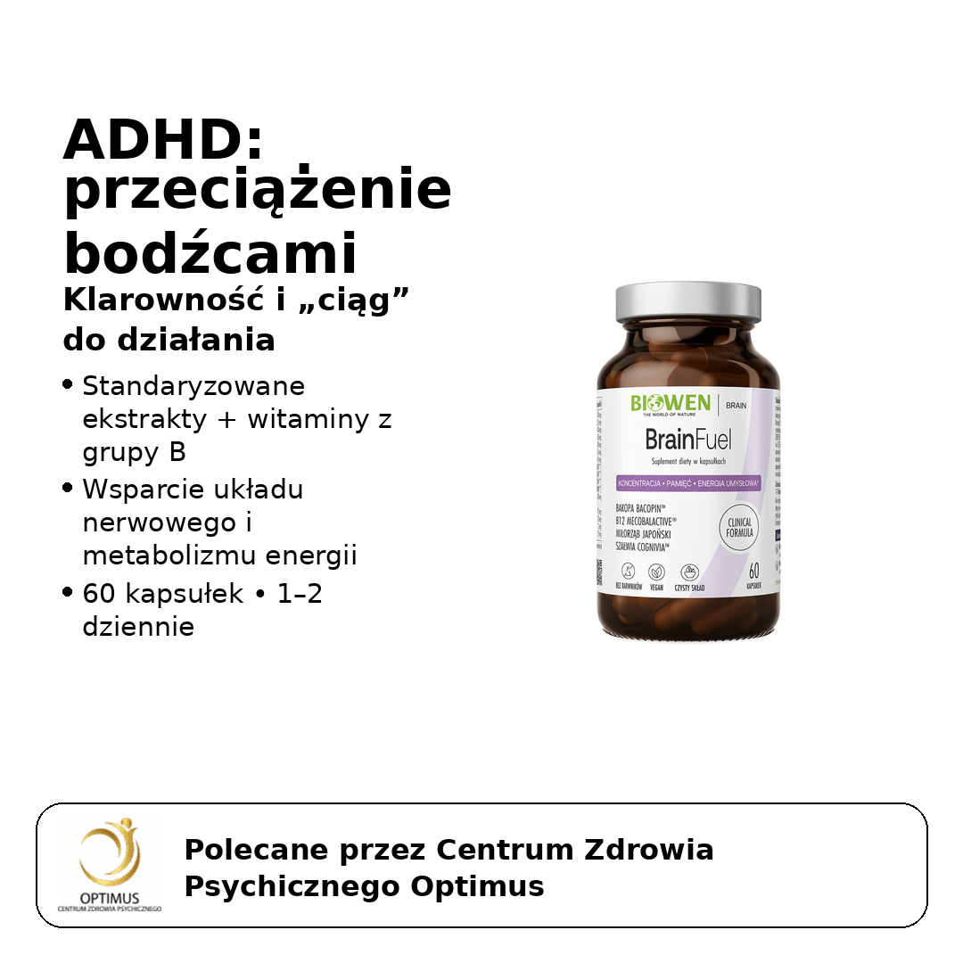 BrainFuel to suplement wspierający koncentrację, pamięć i energię mentalną. W Centrum Optimus traktujemy go jako narzędzie pomocne przy rozproszeniu i przeciążeniu bodźcami — jako dodatek do planu: sen, rutyny i regeneracja.