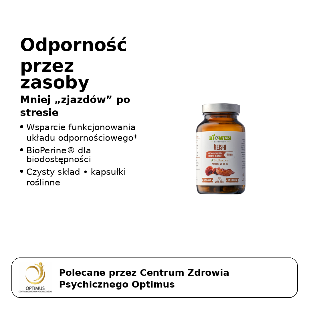 Reishi Biowen to grzyb witalny standaryzowany na polisacharydy i beta-glukany, z dodatkiem BioPerine®. W Centrum Optimus traktujemy go jako spokojne wsparcie regeneracji i równowagi w okresach przeciążenia