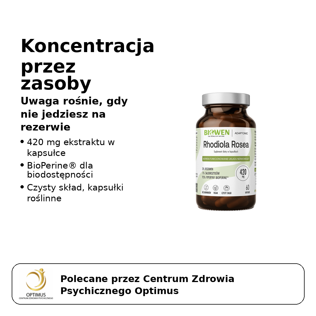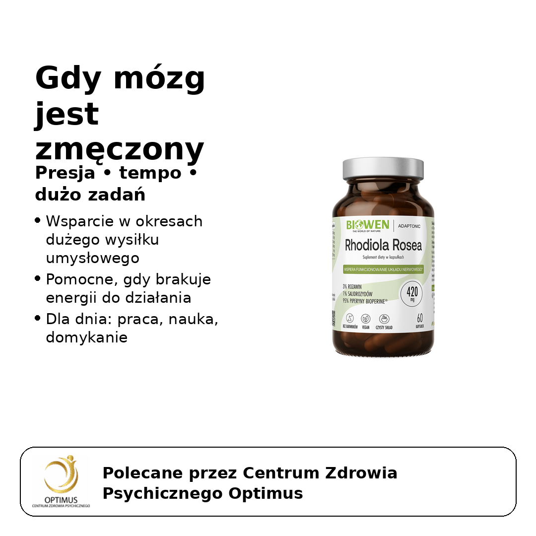 To nie jest lek. To suplement diety, który w Centrum Optimus ustawiamy prosto: gdy stres i tempo dnia zjadają zasoby, spada energia – a wtedy spada też koncentracja. Rhodiola ma wspierać Twoje „paliwo na dzień”, żeby łatwiej dowozić zadania bez chaosu i ciągłych spadków mocy.