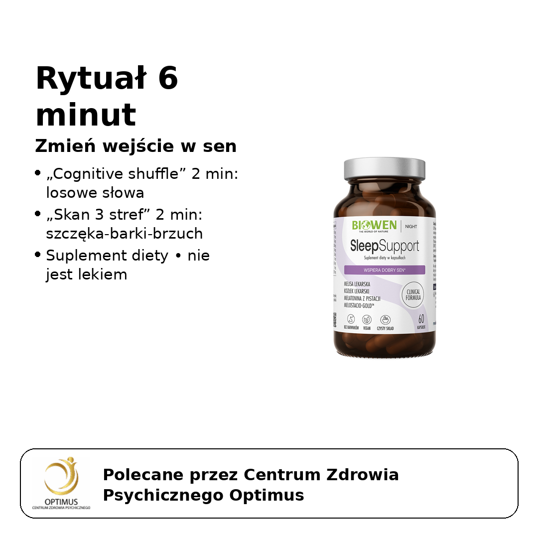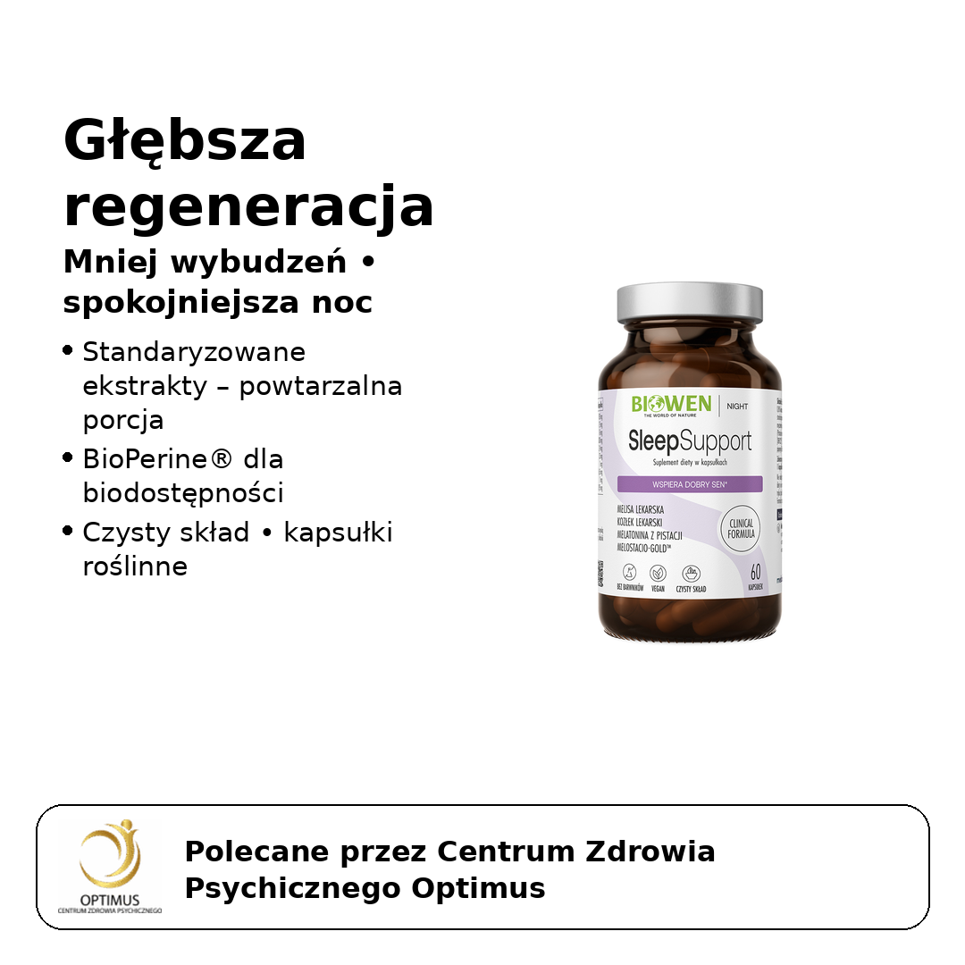 SleepSupport to wsparcie na noc dla osób, które są zmęczone, ale nie potrafią wejść w sen: myśli kręcą się w kółko, ciało jest niespokojne, a zasypianie się przeciąga lub sen jest płytki. W Centrum Zdrowia Psychicznego Optimus traktujemy go jako narzędzie do „przełączenia” w tryb snu i regeneracji — jako dodatek do wieczornej rutyny (mniej bodźców, wyciszenie), nie jej zamiennik.